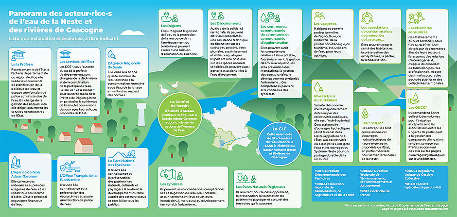 La Commission Locale de l’Eau Neste et Rivières de Gascogne travaille en lien avec l’ensemble de ces acteurs qui sont associés à la construction du Schéma d’Aménagement et de Gestion des Eaux (SAGE) : partage des informations et des données du territoire, sensibilisation aux enjeux de l’eau, association aux groupes de travail et évènements (commissions géographiques, concertation citoyenne…)