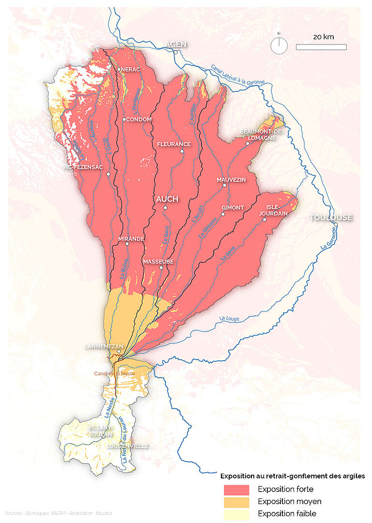 En fonction de leur teneur en eau, les argiles - constituant les sols - peuvent gonfler ou dégonfler : le sol et le sous-sol peuvent ainsi se déformer et provoquer des dégâts notamment au niveau des bâtiments (fissures etc.). La partie gasconne du territoire est fortement exposée à ce risque de retrait et gonflement des argiles.